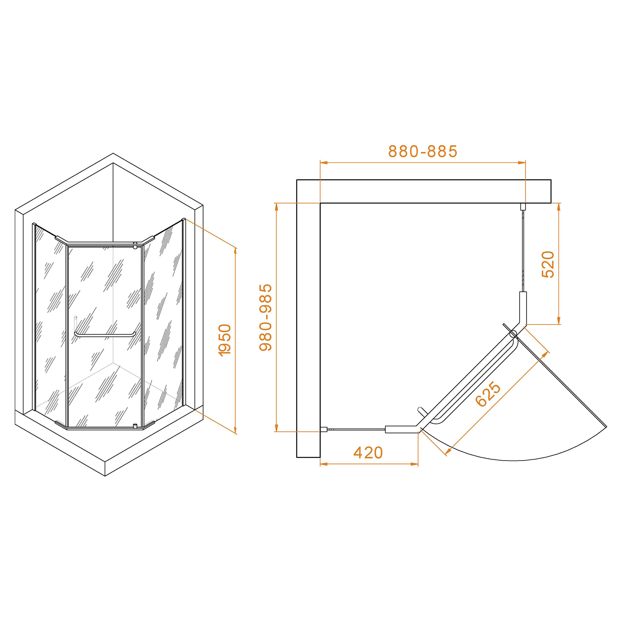 Высота уголка составляет 1950 мм, что обеспечивает достаточное пространство для комфортного принятия душа. Высокая конструкция уголка также предотвращает попадание воды на пол ванной комнаты, обеспечивая ее чистоту и сухость.