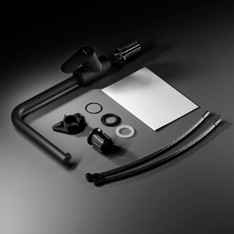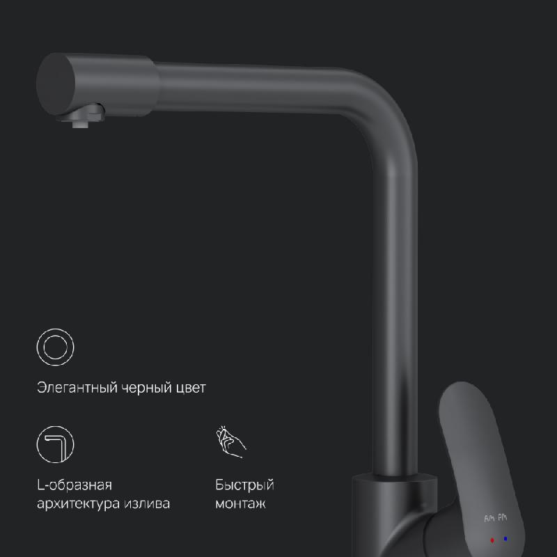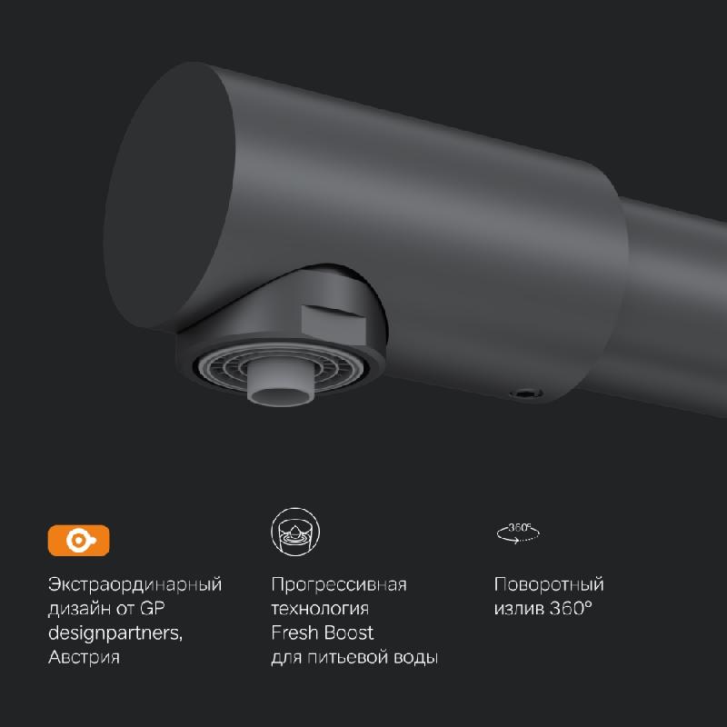 F8005722 Like, смеситель для кухни с каналом для питьевой воды, L-излив, черный матовый, шт.Долгожданное пополнение в линейке кухонных смесителей Like – смеситель для кухни со встроенным каналом для питьевой воды. L-образная архитектура излива позволит разместить смеситель на мойке любого размера и даже под низкими шкафчиками при полном сохранении функционала и комфорта в использовании.