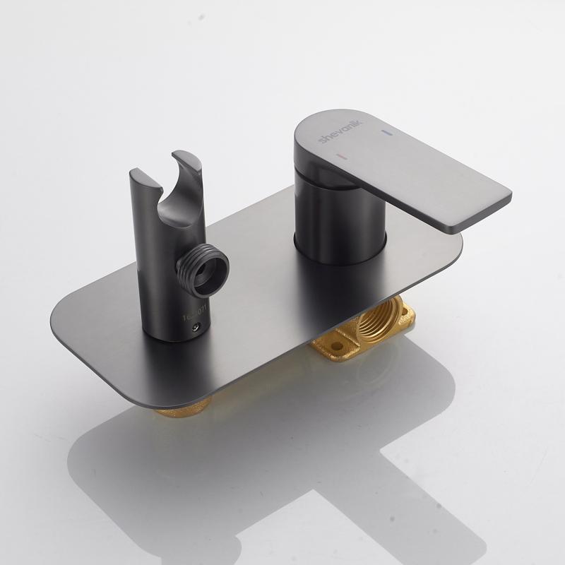 Гигиенический душ со смесителем Shevanik S4105T в современном цвете "оружейная сталь" — это идеальное решение для вашей ванной комнаты, сочетающее в себе элегантность и функциональность. Смеситель выполнен из прочной латуни, что гарантирует его долговечность и надежность. Благодаря скрытому монтажу в стену, он обеспечивает аккуратный и современный внешний вид, а керамический картридж и рычажное управление делают его использование легким и удобным.