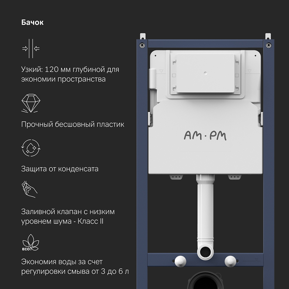 Максимально полный комплект поставки, включающий все необходимые крепления, патрубки, звукоизолирующую прокладку. Экономия пространства благодаря узкому бачку – 120 мм глубиной. Заливной клапан с низким уровнем шума - Класс II, согласно европейского стандарта EN 14124.