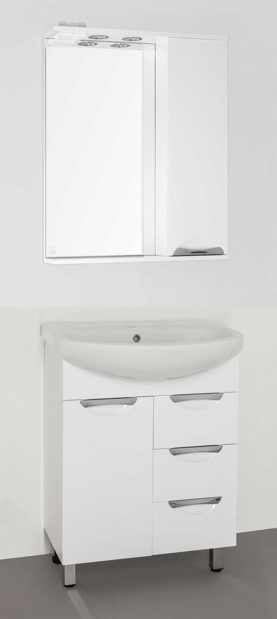 зеркальный шкаф "Жасмин" (выписывается отдельно, выбирайте вариант поставки), керамическая раковина "Стелла 65" белая, напольная тумба-умывальник "Жасмин 65", цвет - белый глянец