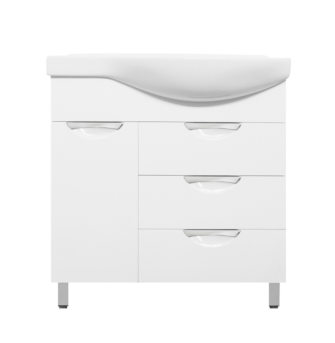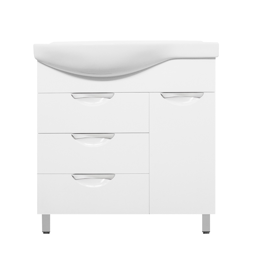 зеркальный шкаф "Жасмин" (выписывается отдельно, выбирайте вариант поставки), керамическая раковина "Коралл 83" белая с крылом слева или справа, напольная тумба-умывальник "Жасмин 82" с бельевой корзиной и 3мя выдвижными ящиками, цвет - белый глянец