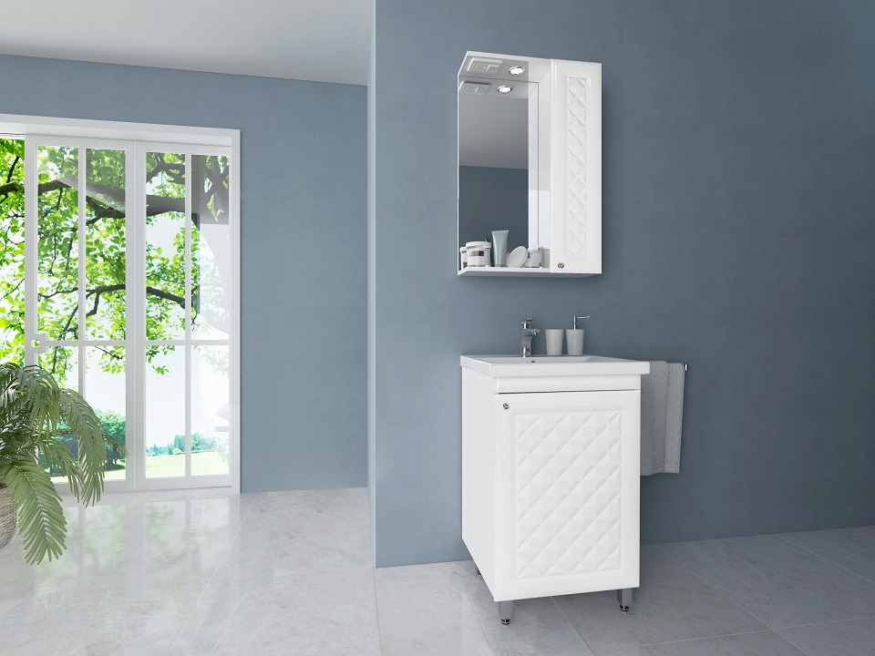 зеркальный шкаф выбирается в "вариантах поставки", напольная тумба-умывальник, керамическая раковина Комо 50, 2 распашных двери, цвет - белый