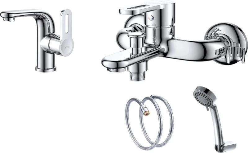 Смеситель для раковины, гибкая подводка-2шт, крепежная гайка, паспорт изделия, брендовая сумка; смеситель для ванны, эксцентрики-2шт, декоративная шайба (отражатель)-2шт, шланг душевой, лейка душевая-3 режима, держатель душевой лейки, паспорт, брендовая сумка.