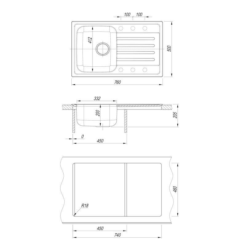Материал чаши мойки - нержавеющая сталь марки AISI 304, толщина 0,8 мм.