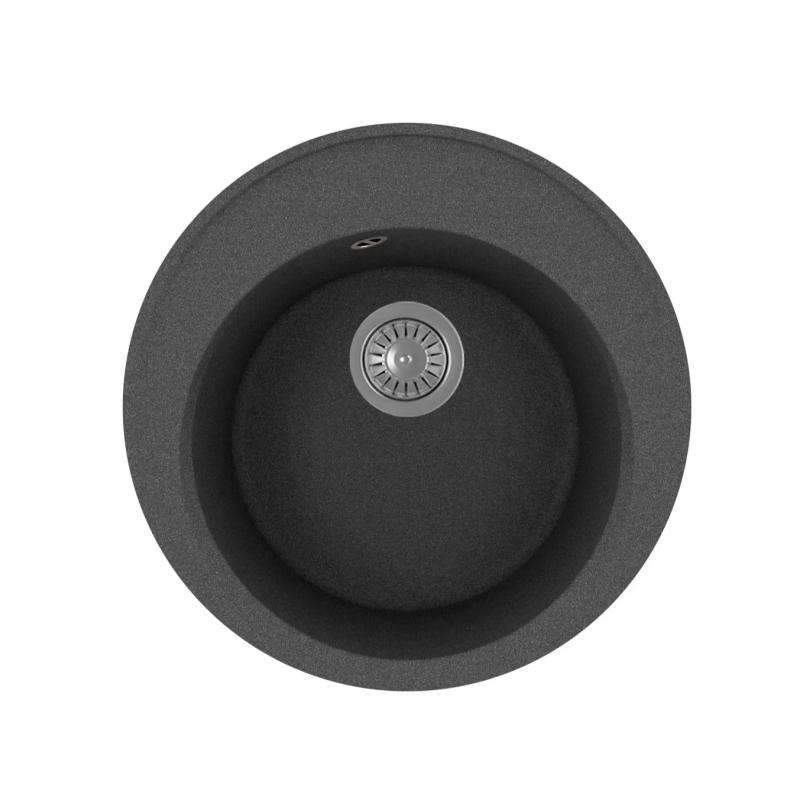 Круглая мойка с большой чашей для кухонного шкафа 45 см. Материал — кварцевый композит. Предусмотрены дополнительные отверстия для установки аксессуаров.