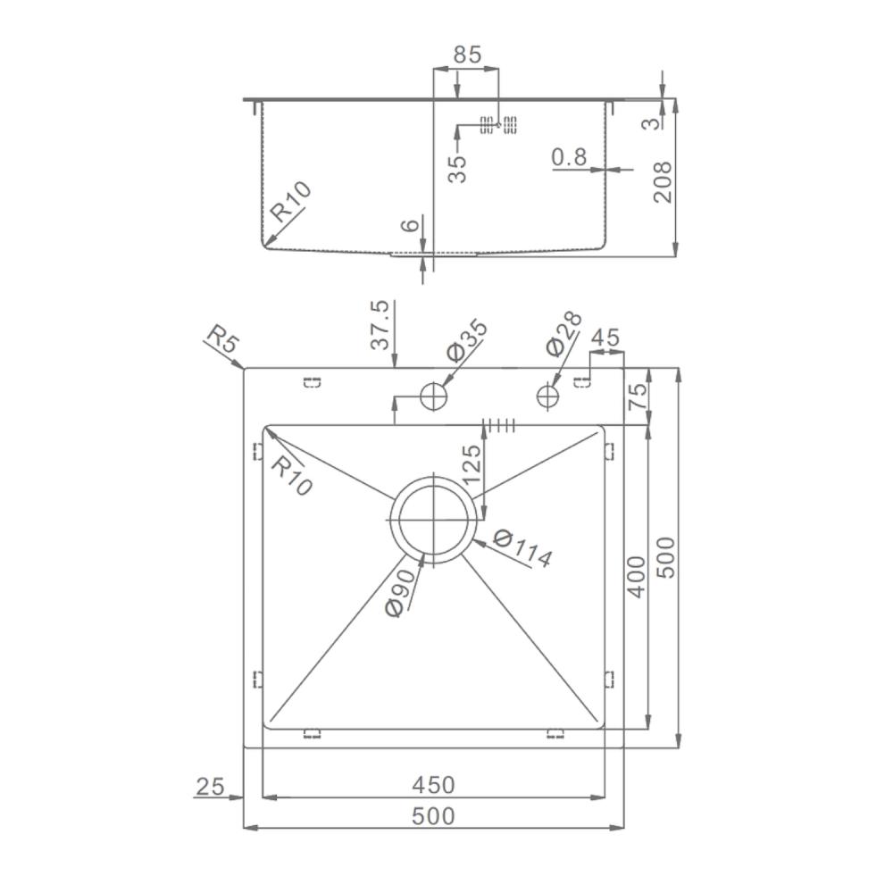 Толщина стали: верх - 3 мм / чаша - 0.8 мм, дополнительное отверстие для установки дозатора