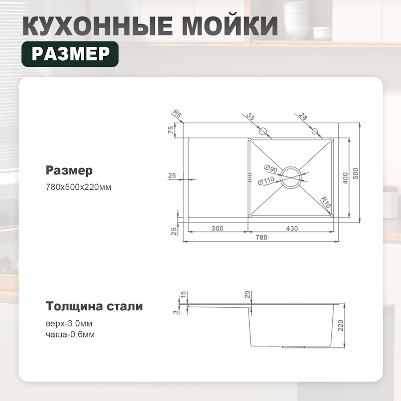 Толщина стали: верх - 3 мм / чаша - 0.6 мм