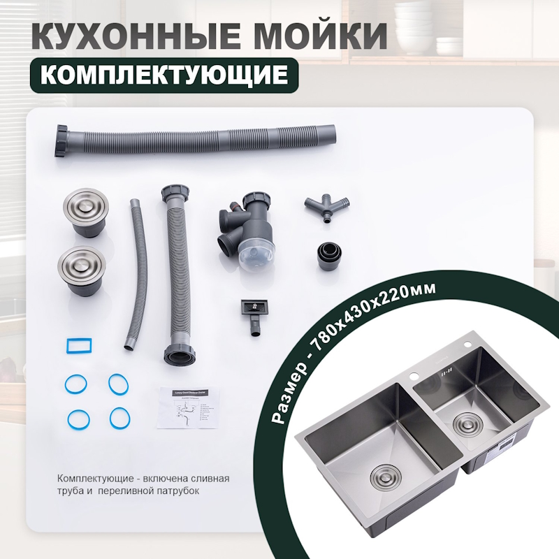 Комплектующие - сифон с выходом для подключения посудомоечной машины и фильтра для питьевой воды, крепление.
