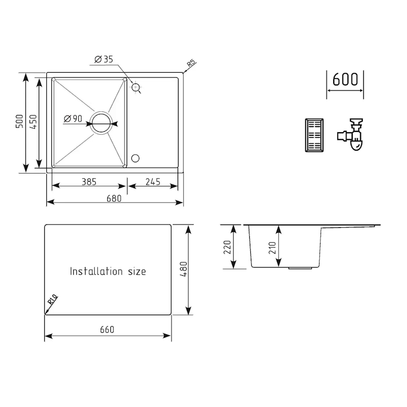 Мойка имеет премиальную толщину монтажной полки 3 мм и увеличенную толщину чаши и крыла 1,2 мм. Эргономичный современный дизайн с глубиной чаши 210 мм делает мойку вместительной и удобной в эксплуатации, а на дне чаши расположены лучи-направляющие, которые позволяют воде легче стекать, не задерживаясь в чаше с горизонтальным плоским дном. Мойка имеет классический врезной монтаж на столешницу, минимальная мебельная база шкафа составляет 600 мм.