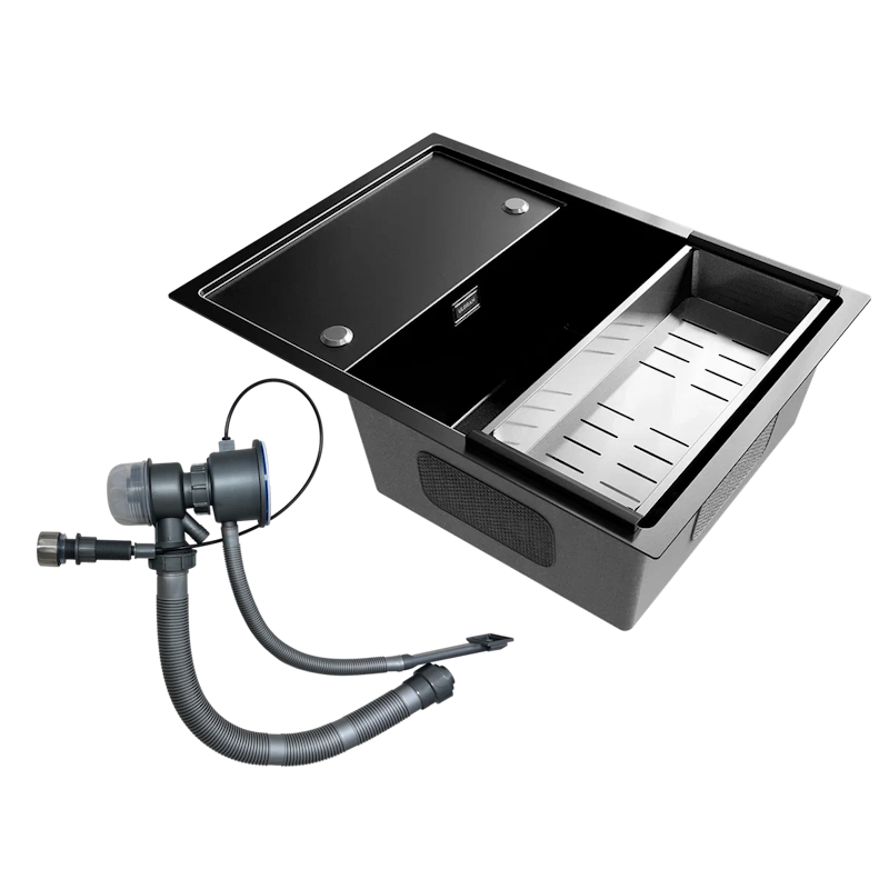 Изделие имеет богатую комплектацию, состоящую из коландера из хирургической стали марки AISI 304 и высококачественной сливной арматуры с клапан-полуавтоматом, а также с отводом под стиральную машину.