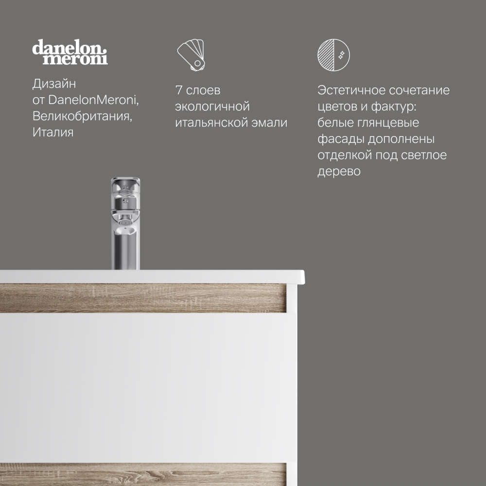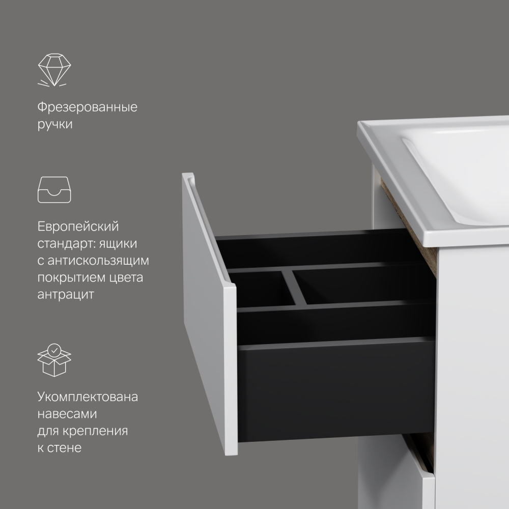 цвете Anthracite и имеет противоскользящее покрытие. Встроенная керамическая раковина белоснежного цвета оснащена специальным бортиком для защиты от пролива воды за мебель.