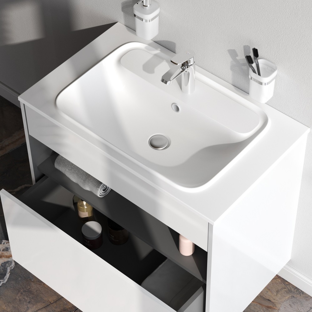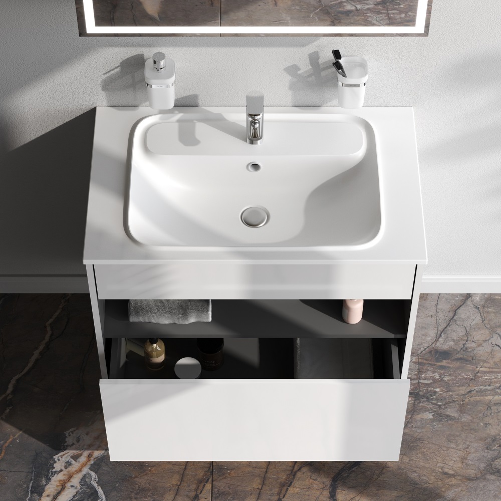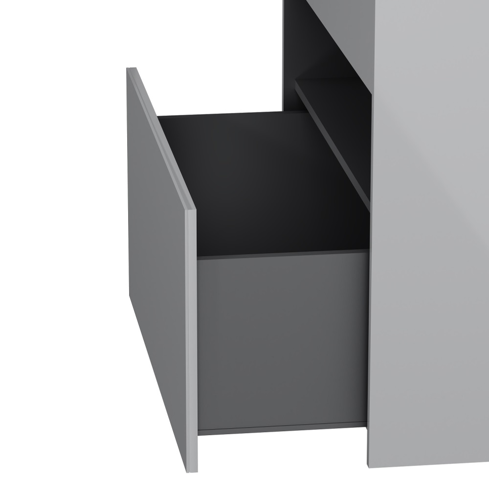 Удобный выдвижной ящик и вместительная открытая ниша позволяют хранить все необходимые средства под рукой. Невероятно мягкое открытие и закрытие благодаря направляющим скрытого монтажа с системой soft close.