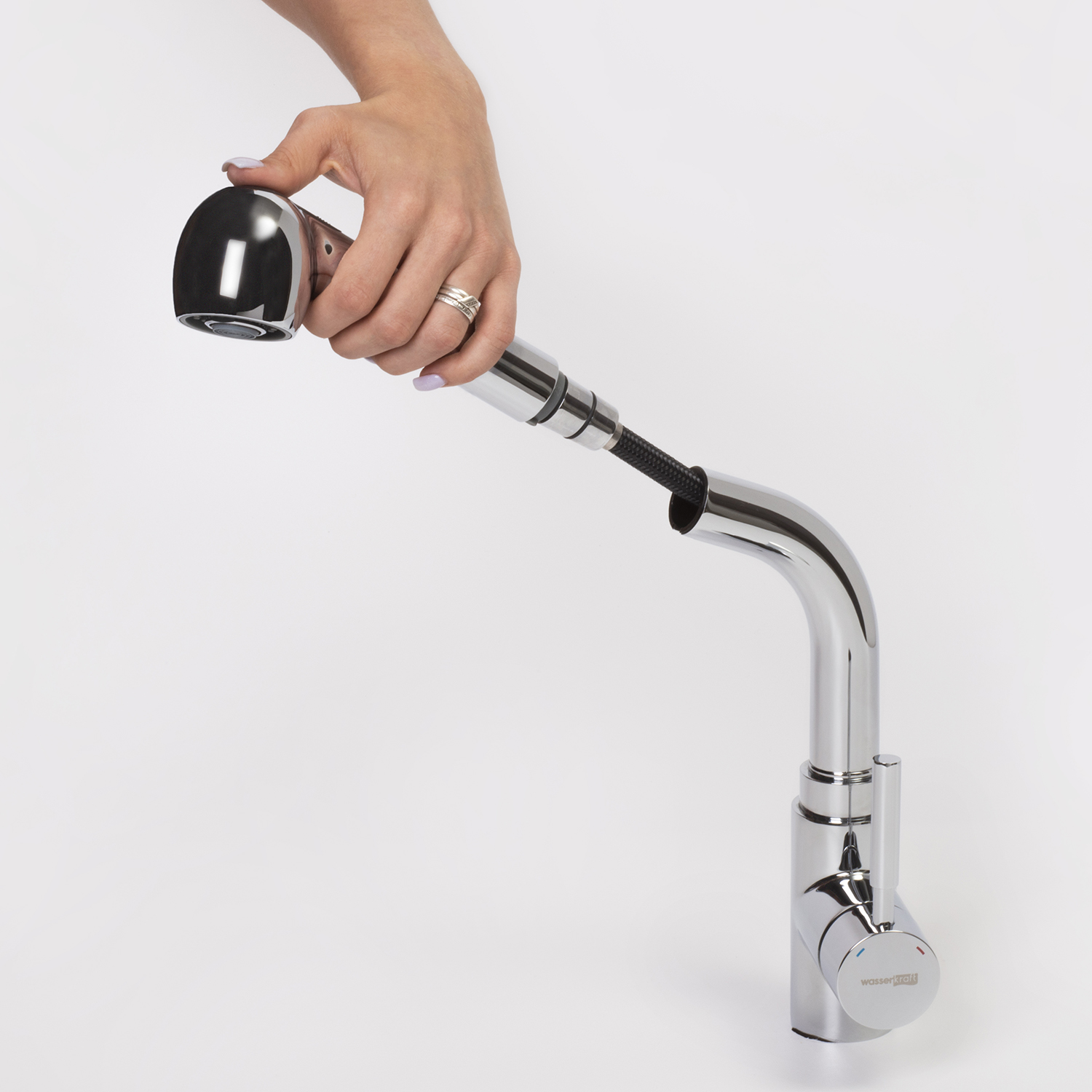 Смеситель имеет в комплекте выдвижную лейку. Корпус смесителей произведен из высококачественной латуни с содержанием меди не менее 59%. Латунь является наилучшим материалом для изготовления корпуса смесителей, характеризуется долговечностью и прочностью. Коллекция имеет хромоникелевое покрытие. Хромоникелевое покрытие, устойчивое к потускнению, легко очищается и придает смесителям зеркальный блеск и серебристый цвет. Для ухода за изделиями достаточно теплой воды, мыльного раствора и сухого полотенца. В смесителях используются керамические картриджи 35 мм, Sedal (Испания). Все картриджи выдерживают 500 000 рабочих циклов (открытий / закрытий). Смесители оснащены встроенным пластиковым аэратором Neoperl CASCADE (Германия) для равномерного распределения струи. Аэраторы Neoperl CASCADE отличаются прочностью, не подвержены разрушению и образованию известковых отложений. Смесители для умывальника и кухни в комплекте имеют гибкую подводку Sedal (Испания), с резьбой G½.