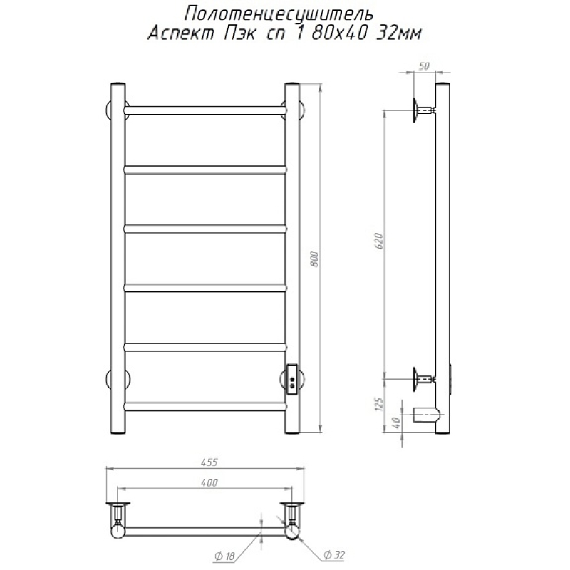 Полотенцесушитель Аспект Пэк сп 1 80х40 32 мм. Коллекция: Аспект Пэк сп серия 1. Тип: электрический. Форма: лесенка. Мощность (Вт): не более 100Вт. Количество перекладин: 6. Материал: нержавеющая сталь AISI 201. Подключение: скрытое электрическое соединение/электропровод с вилкой.