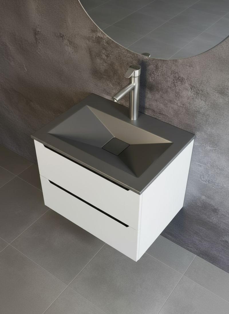 Полувстраиваемая раковина Uperwood Geo 70 см (графит) — эффектное решение для современной ванной комнаты в стиле лофт и минимализм. По фото модель выделяется выразительной геометрией чаши с чёткими гранями и глубоким графитовым оттенком: такая раковина становится акцентом и отлично сочетается с тёмной плиткой, каменными фактурами и металлической сантехникой.