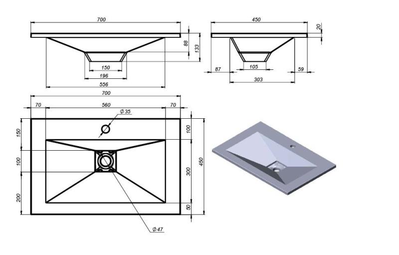 Оптимальные габариты 700×450 мм подходят для компактных и средних ванных комнат, а чаша глубиной 88 мм удобна для умывания и повседневных задач. Сливное отверстие Ø105 мм.