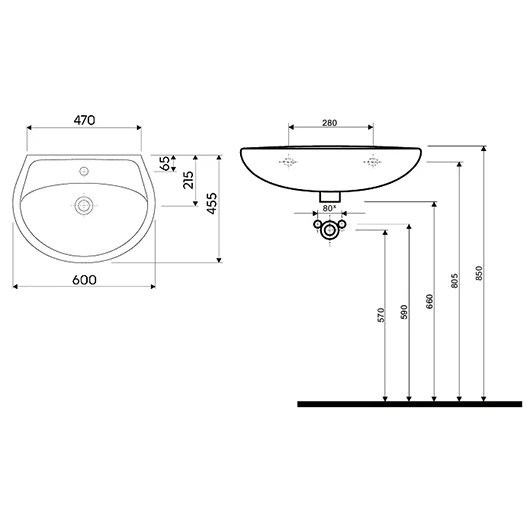 с одним отверстием под смеситель, литой перелив, габариты - 60х45,5х18 см (ШхГхВ)