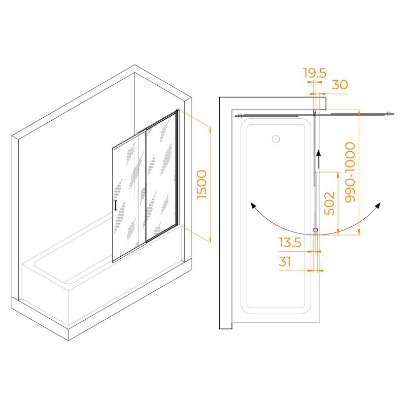 Профиль шторки выполнен в черном цвете, что прекрасно сочетается с любым стилем ванной комнаты. Высота стеклянной шторки составляет 1500 мм, что обеспечивает максимальную защиту от брызг и капель.