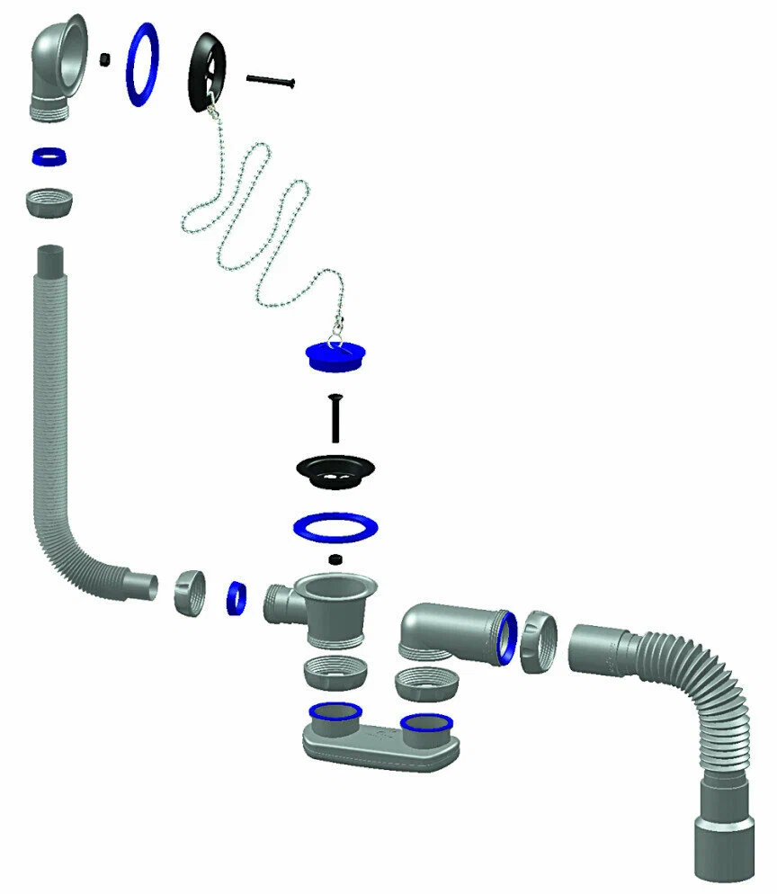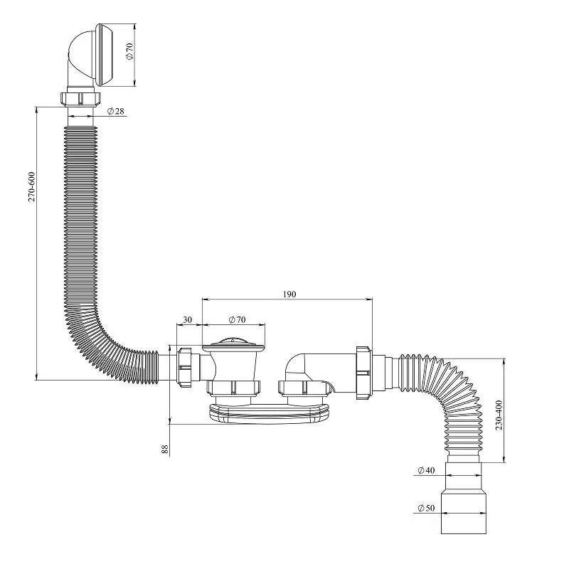 с регулируемым сифоном 1 1/2"х40 мм, с гибкой трубой 40х50 мм, с пробкой