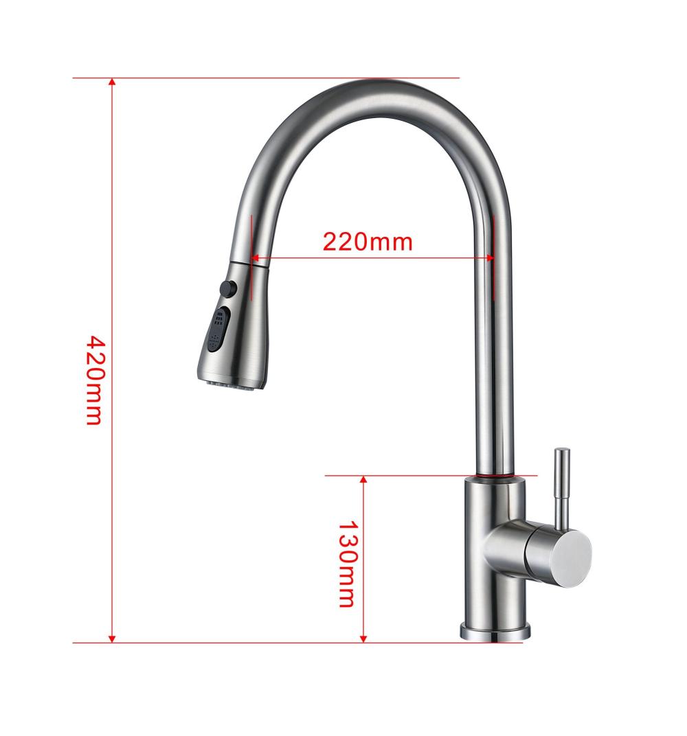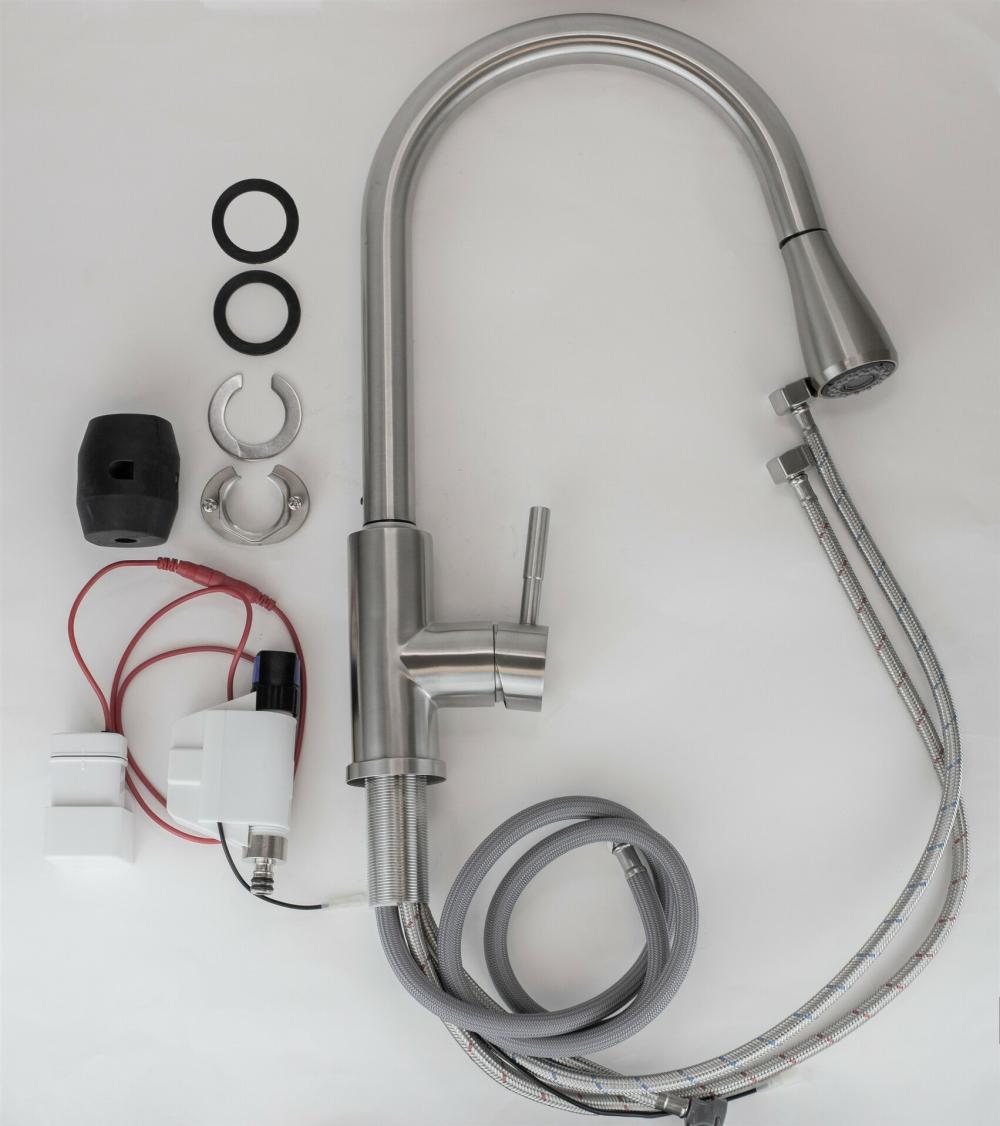 Смеситель выдвижной с тач-сенсором. Корпус: нержавеющая сталь, марка SUS 304 (пищевая сталь) ,кнопочное переключение режимов "лейка - аэратор", кнопка прерывания потока. Излив: поворотный - вытяжной ,нерж. cталь Картридж: универсальный ESKO, 40мм Комплектация: пьедестал(металл), крепление усиленное FastFix, гибкая подводка 65см, груз - утяжелитель для вытяжного шланга, электронный тач контроллер, электро блок на 4 батарейки AA 1.5V