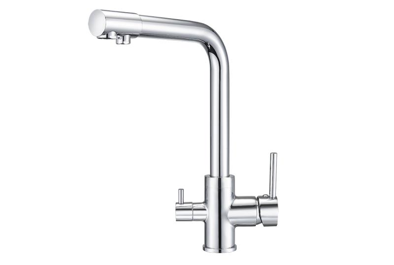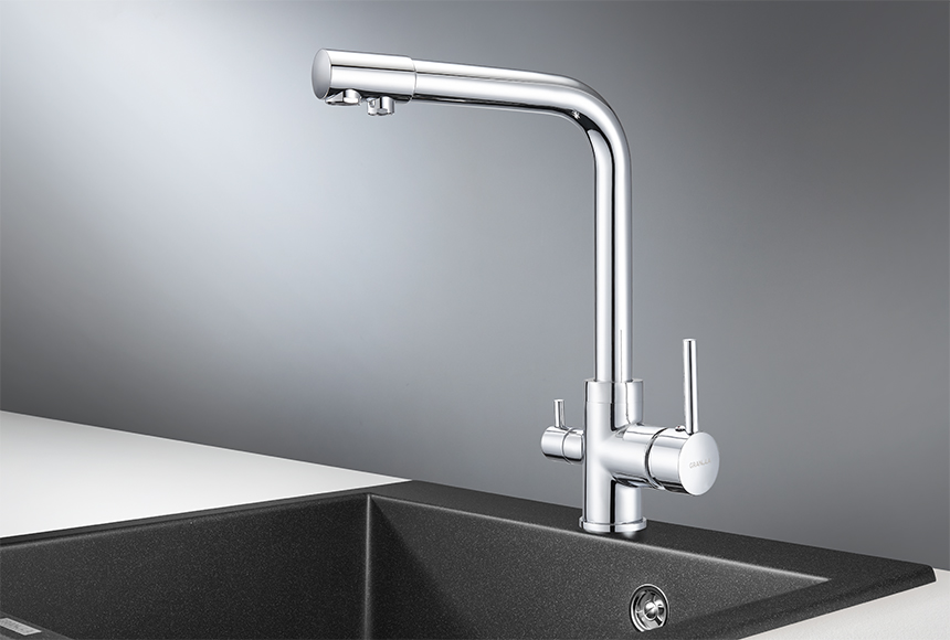 Смеситель для кухонной мойки Granula 2015 изготовлен из высококачественного материала. Латунный корпус обеспечивает длительный срок службы. При этом высокий излив позволяет мыть как мелкую, так и крупногабаритную посуду. Двухрычажная модель смесителя Granula 2015 выполнена с краном для питьевой воды. Фильтрованная вода подается по отдельной трубке и не смешивается с водопроводной водой.