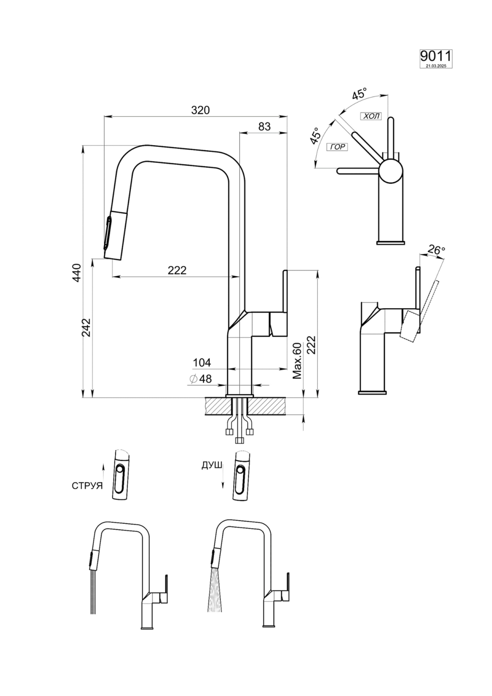 Смеситель оснащен выдвижным изливом и ограниченным ходом ручки, что позволяет установить его даже в условиях ограниченного пространства, например, у стены. Вы сможете легко переключаться между двумя режимами подачи воды: струя и душ.<br>