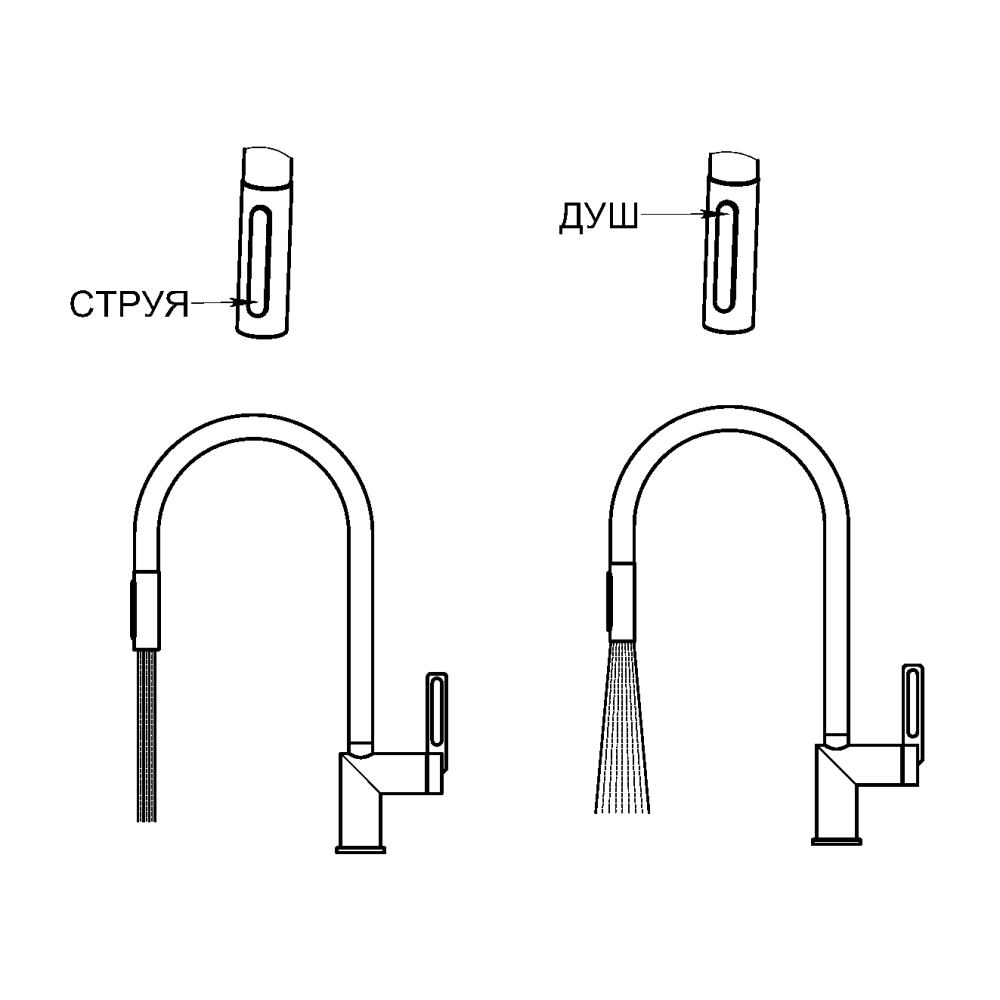 Переключение между режимами подачи воды (душ, лейка) – позволяет снизить расход воды, легче мыть посуду смывать моющее средство благодаря режиму душа._x005F