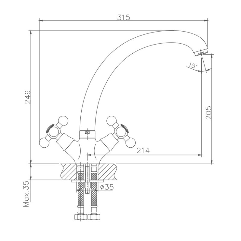 Смеситель для кухни бренда Haiba. Изготовлен из латуни. Укомплектован аэратором. Гибкая подводка 40 см. С поворотным изливом.