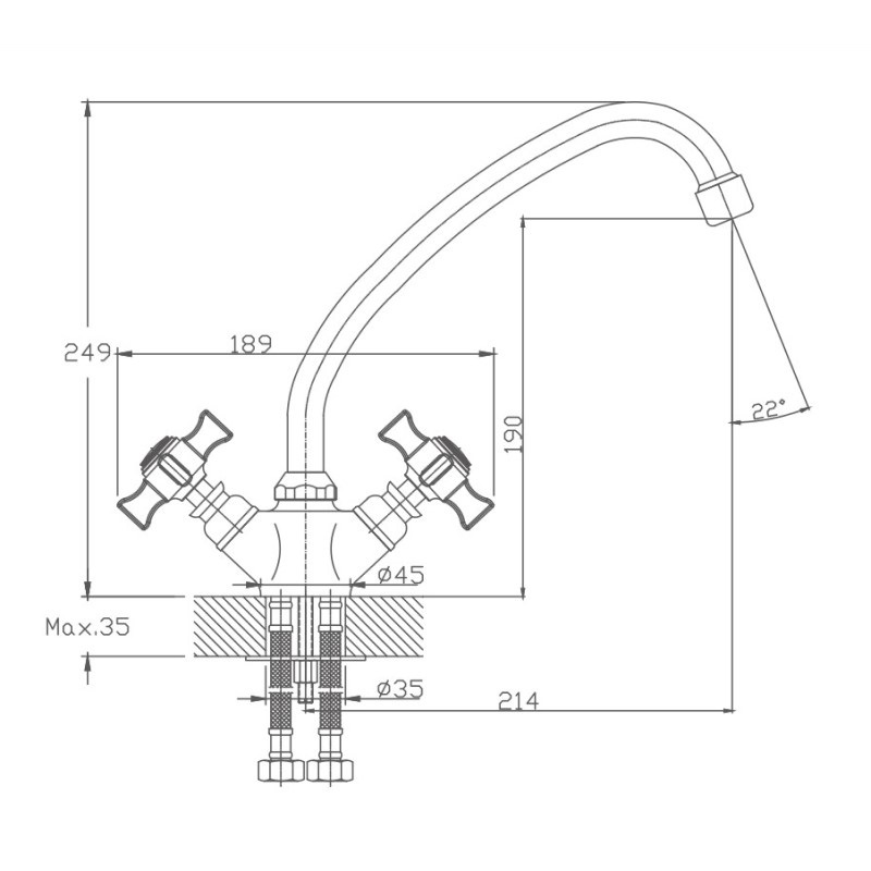 Смеситель для кухни бренда Haiba. Изготовлен из латуни. Укомплектован аэратором. Гибкая подводка 40 см. С поворотным изливом.
