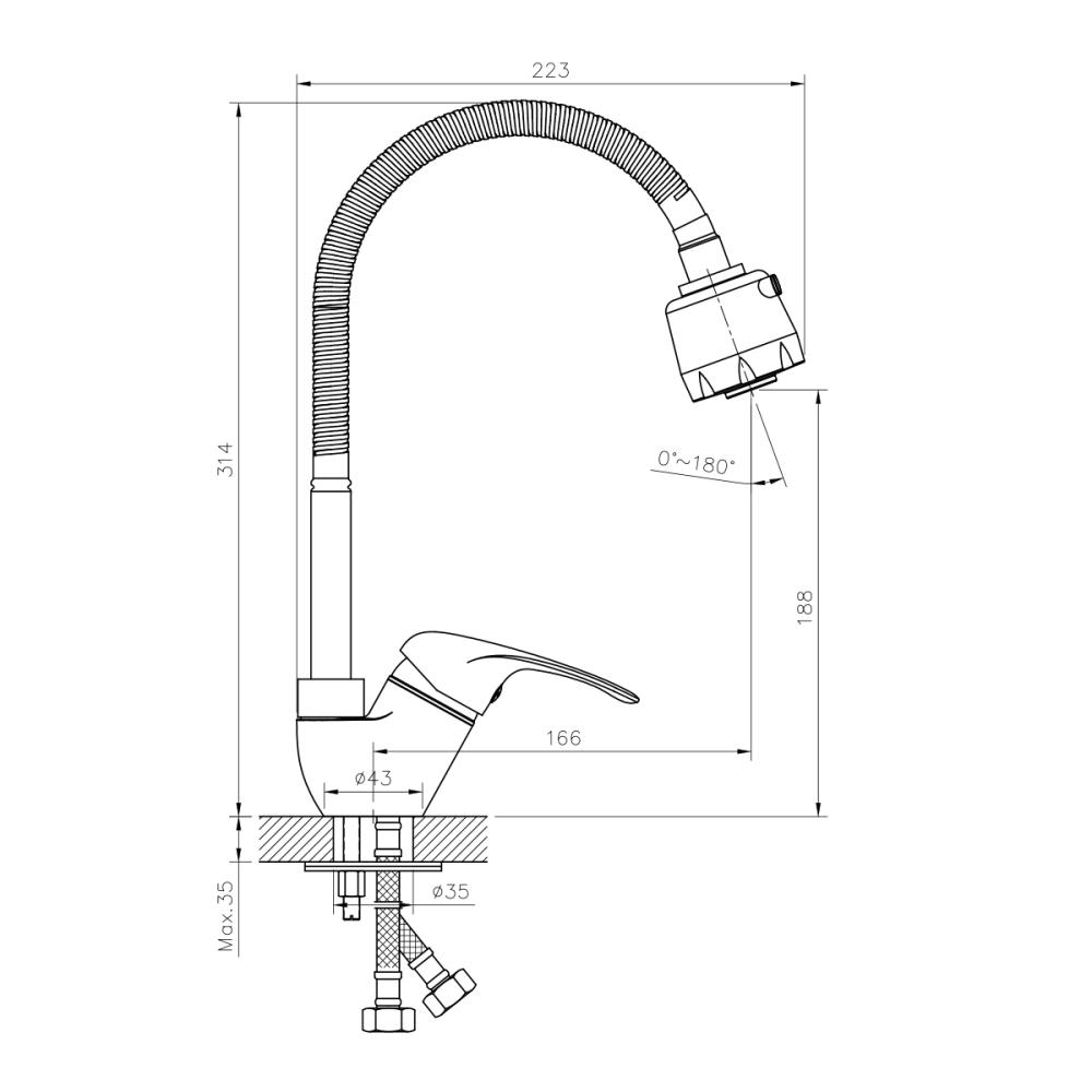 2-х функциональный пластиковый аэратор с функцией легкой очистки. Керамический картридж 35 мм. Гибкая подводка 1/2" 35 см – 2 шт. Присоединительная группа для настольного крепления. Металлическая рукоятка.