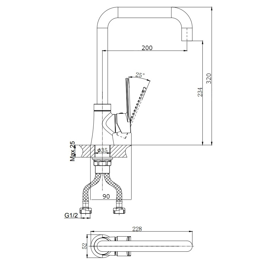 В смеситель установлен картридж D-35 с керамическими пластинами. Высота смесителя 320 мм. Излив поворотный 200 мм. Высота излива до аэратора 234 мм. Аэратор изготовлен из пластика с нержавеющим корпусом.