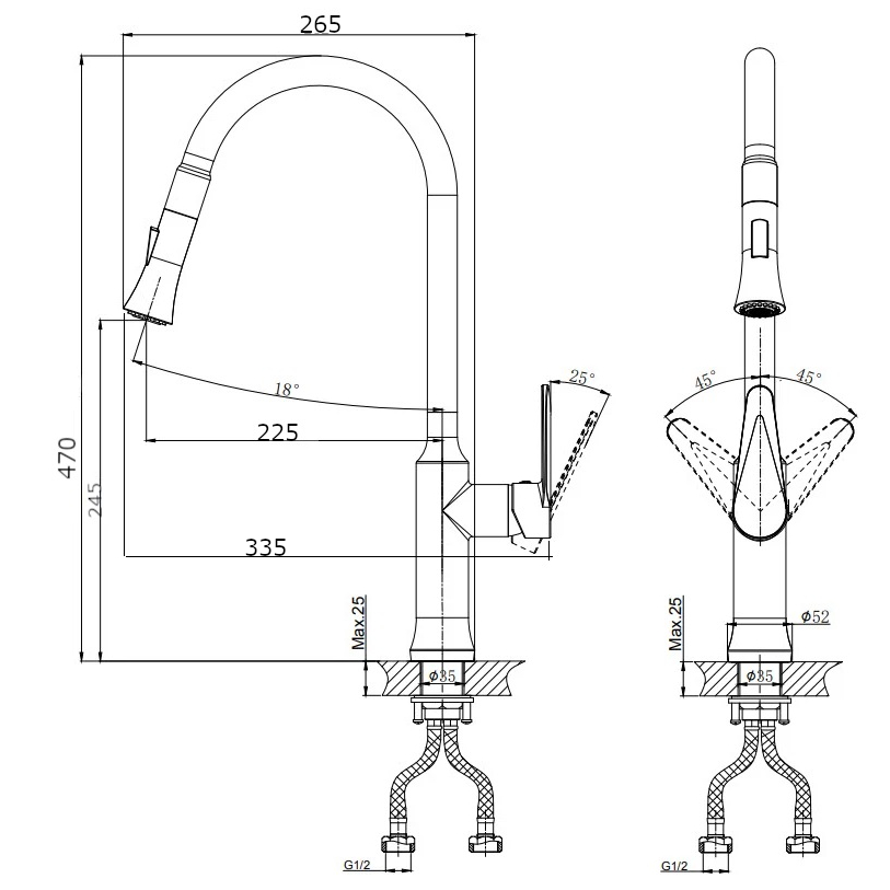 В смеситель установлен картридж D-35 с керамическими пластинами. Высота смесителя 486 мм. Излив поворотный 225 мм. Высота излива до аэратора 245 мм. Аэратор изготовлен из пластика с нержавеющим корпусом, угол наклона аэратора-18гр.
