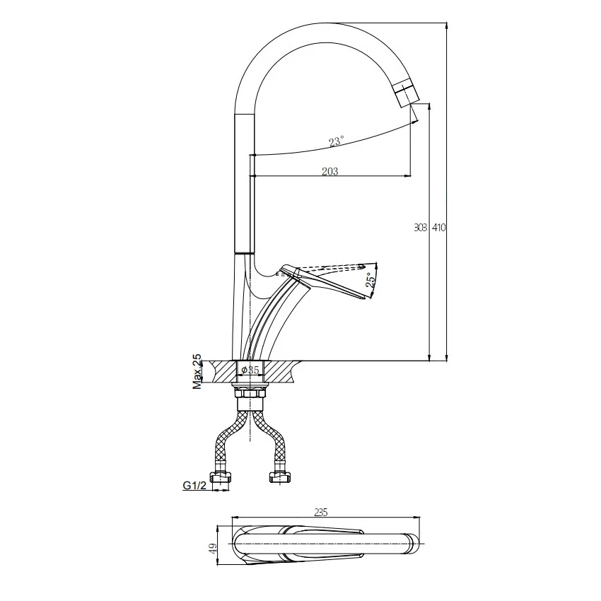 Смеситель для кухни RUSH арт. NE1735-22 с поворотным изливом с металлической ручкой из коллекции Nevis изготовлен из высококачественной латуни и имеет рычажное управление. В смеситель установлен картридж D-35 с керамическими пластинами. Высота смесителя 410 мм. Излив поворотный 203 мм. Высота излива до аэратора 308 мм. Аэратор изготовлен из пластика с нержавеющим корпусом, угол наклона -23 гр. В комплекте гибкая подводка с латунными гайками 40см - 2 шт., универсальная присоединительная группа для установки на горизонтальную поверхность, фум-лента, индивидуальный пакет, паспорт, гарантийный талон.