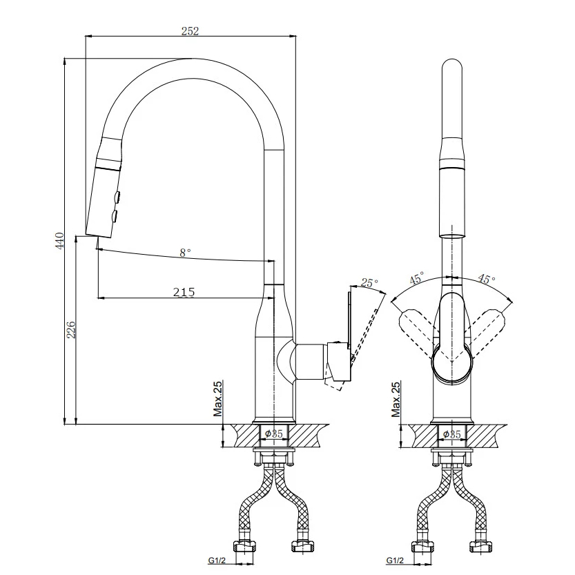В смеситель установлен картридж D-35 с керамическими пластинами. Высота смесителя 440 мм. Излив поворотный 211 мм. Высота излива до аэратора 226 мм. Аэратор изготовлен из пластика с нержавеющим корпусом.