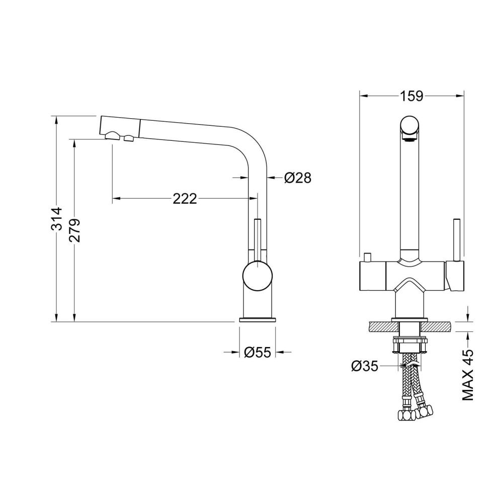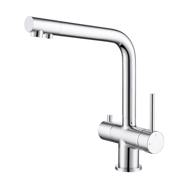 Смеситель Timo Saona 2396 с системой подключения фильтрованной воды относится к премиальному сегменту, предназначен для монтажа на кухонную мойку или столешницу. Высокий излив подходит для моек с двумя чашами, а также позволяет справляться с мытьем габаритной посуды. Удобное (вертикальное) расположение рычага смесителя в крайнем положении "холодный старт", позволяет не задевать ручкой за стеновые панели, фартук, предметы, которые находятся за смесителем. Картридж с функцией "холодный старт" работает в диапозоне 90 градусов, рычаг установленный в исходное положение (вертикально) при открытии подает только холодную воду, а не 50% холодной воды плюс 50% горячей, позволяя экономить до 30% расход горячей воды. В нижней части смесителя установлены 2 трубки с адаптером (можно подключиться к любой из них) для соединения с трубкой фильтра. Подача фильтрованной воды осуществляется поворотом ручки дивертора, расположенной слева на корпусе смесителя (от себя или на себя) в зависимости от того какую из трубок вы выбрали для подключения с трубкой фильтра. Вставьте заглушку (входит в комплект) до упора в свободную трубку. Положение 12-00 дивертор выключен. Сложностей монтажа не возникает при установке смесителя опытным сантехником. Внимательно изучите инструкцию по монтажу и эксплуатации.