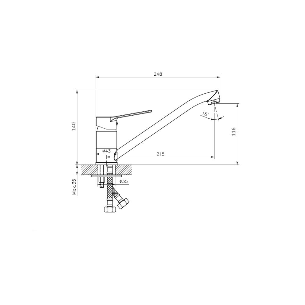 В смеситель установлен картридж D-35 с керамическими пластинами. Высота смесителя 140 мм. Излив поворотный, 215 мм. Высота излива до аэратора 116 мм. Аэратор изготовлен из пластика с нержавеющим корпусом, угол наклона аэратора- 15 гр.