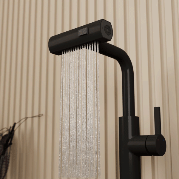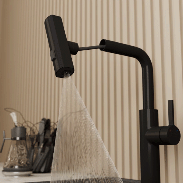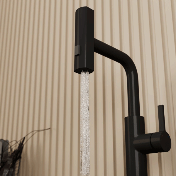 Смеситель для кухни с высоким поворотным изливом и вытяжной лейкой 3-функц. RUSH Tinos арт.TI3732-18Black цвет матовый черный с металлической ручкой изготовлен из нержавеющей стали SUS304 и имеет рычажное управление.