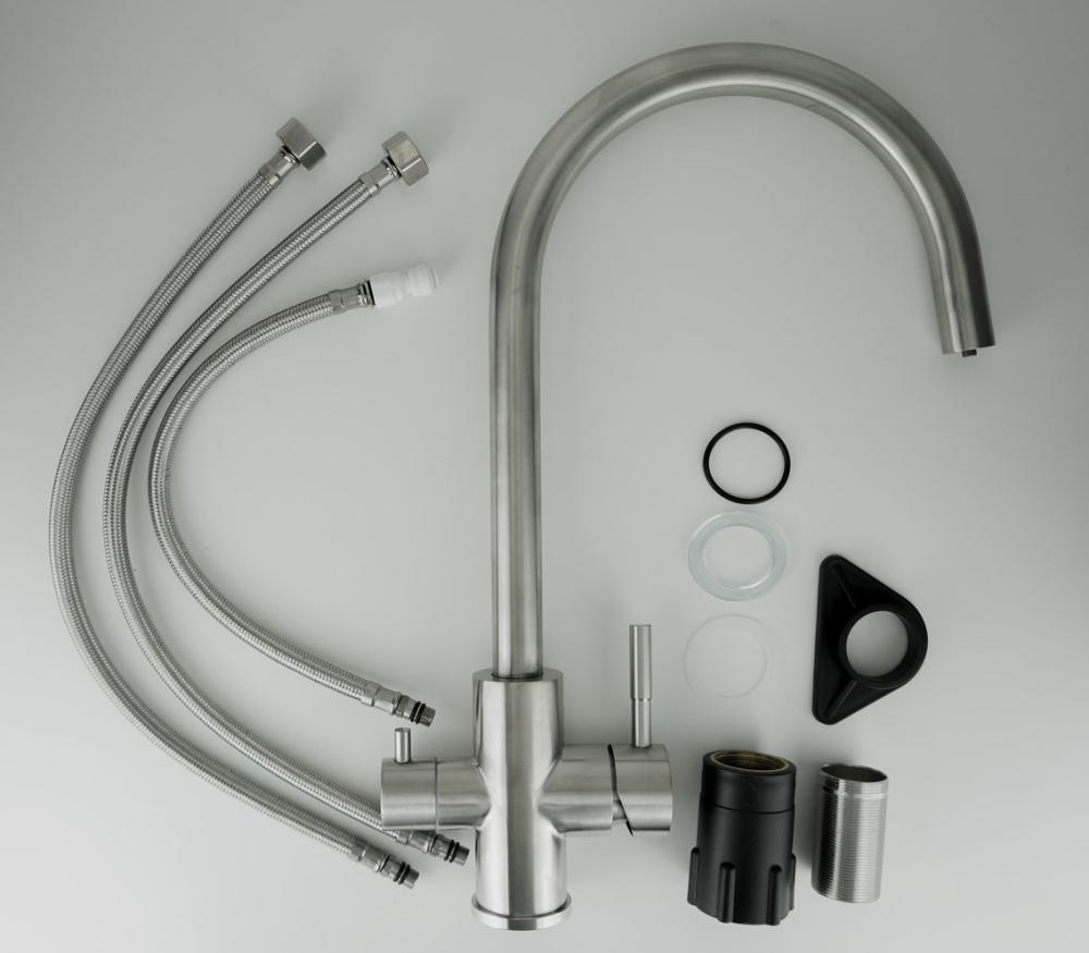 Корпус: нержавеющая сталь, марка SUS 304 (пищевая сталь), аэратор с каналом для фильтрованной воды Излив: поворотный, нерж. сталь Картридж: универсальный ESKO, 35мм Комплектация: пьедестал(металл),ребро жесткости, крепление "FastFix",гибкая подводка 45см, шланг подключения к фильтру.