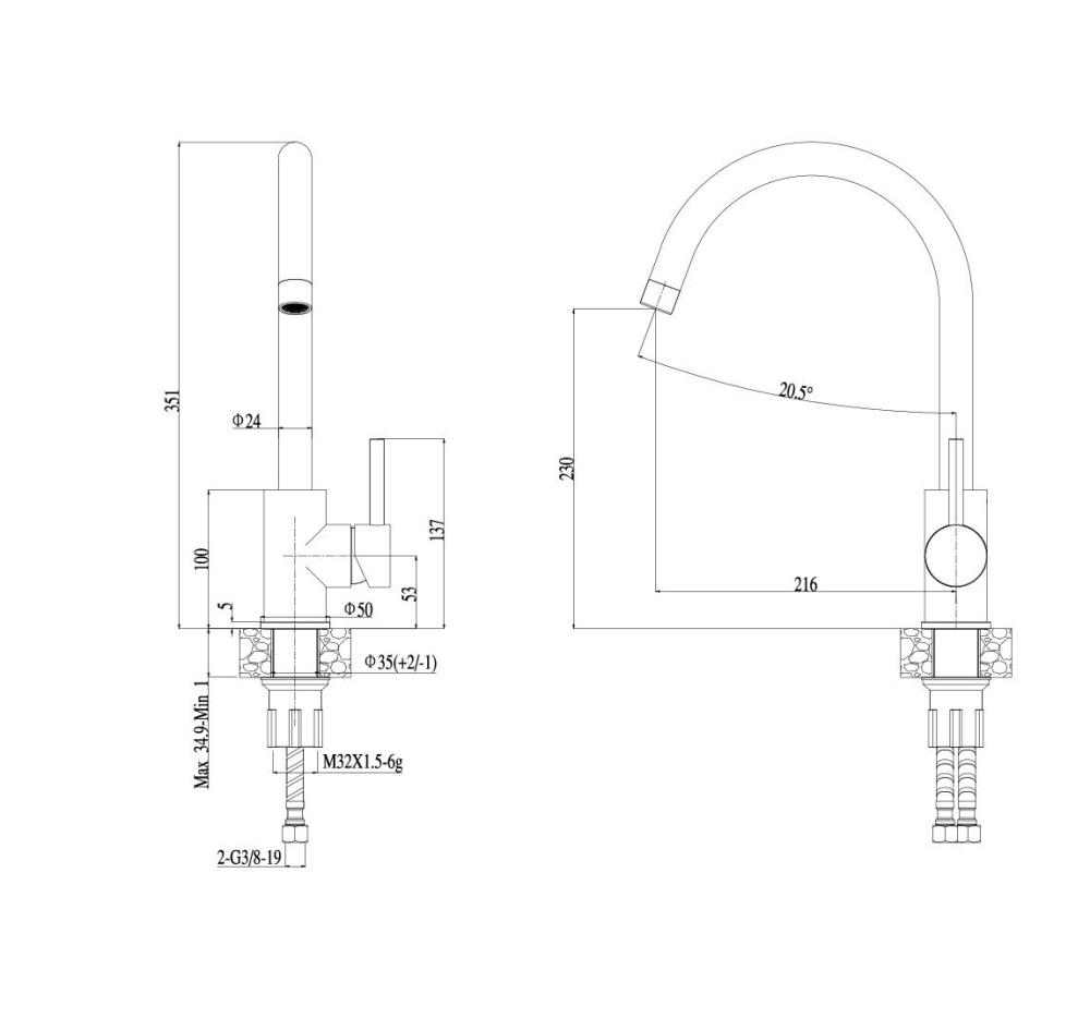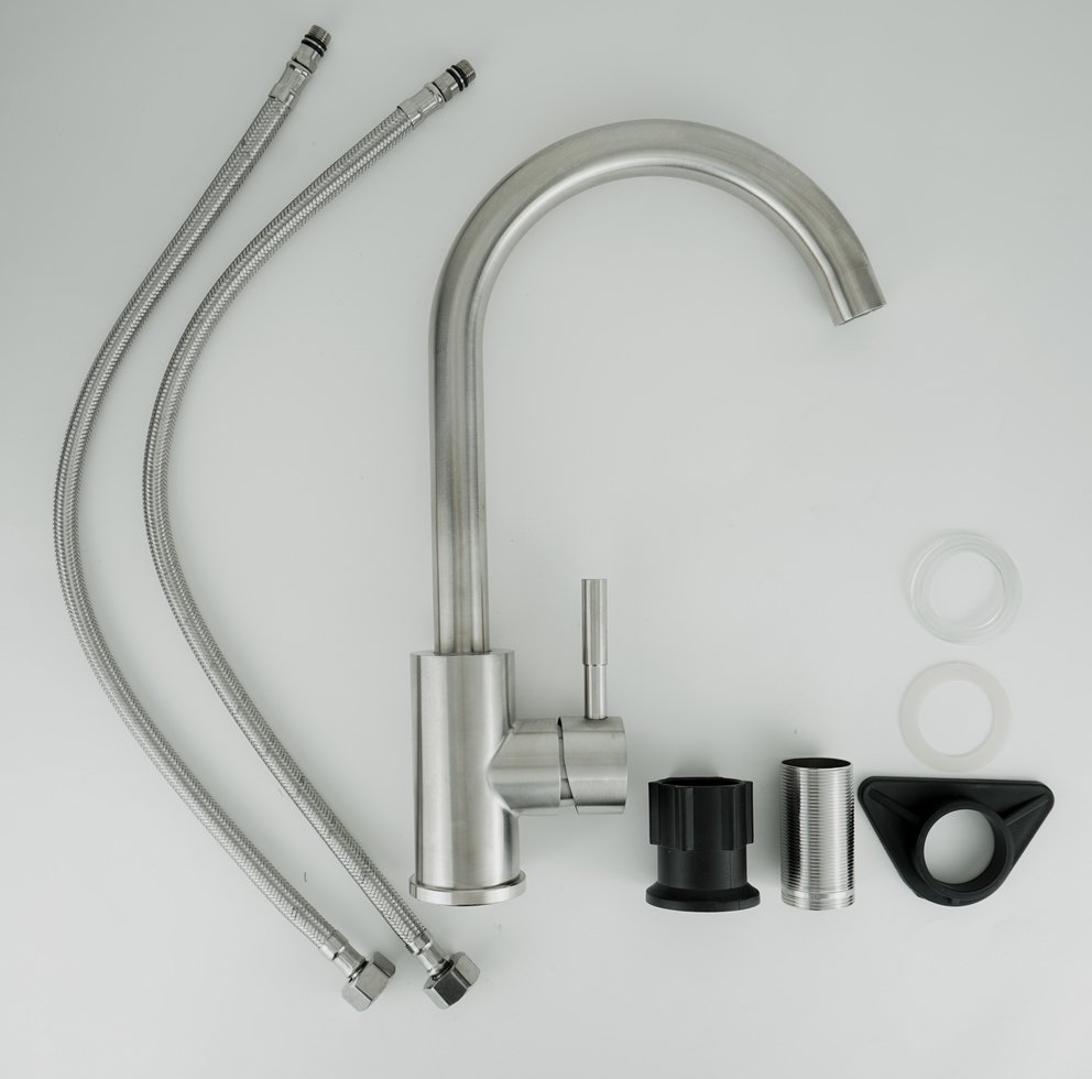 Корпус: нержавеющая сталь, марка SUS 304 (пищевая сталь) Излив: поворотный, нерж. сталь Картридж: универсальный ESKO, 35мм Комплектация: пьедестал(металл), ребро жесткости, крепление "FastFix",гибкая подводка 45см.