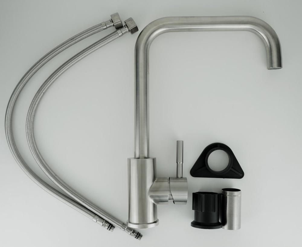 Корпус: нержавеющая сталь, марка SUS 304 (пищевая сталь) Излив: поворотный, нерж. сталь Картридж: универсальный ESKO, 35мм Комплектация: пьедестал(металл), ребро жесткости, крепление "FastFix",гибкая подводка 45см.