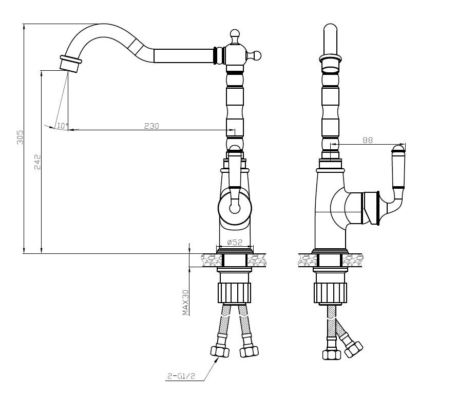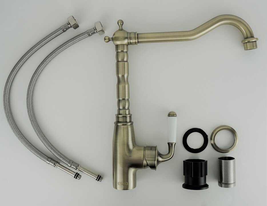 Корпус: латунь кат.A, покрытие "Бронза сатин" Излив: поворотный Картридж: универсальный ESKO, 35мм Комплектация: пьедестал, ребро жесткости, крепление "FastFix",гибкая подводка 40см.