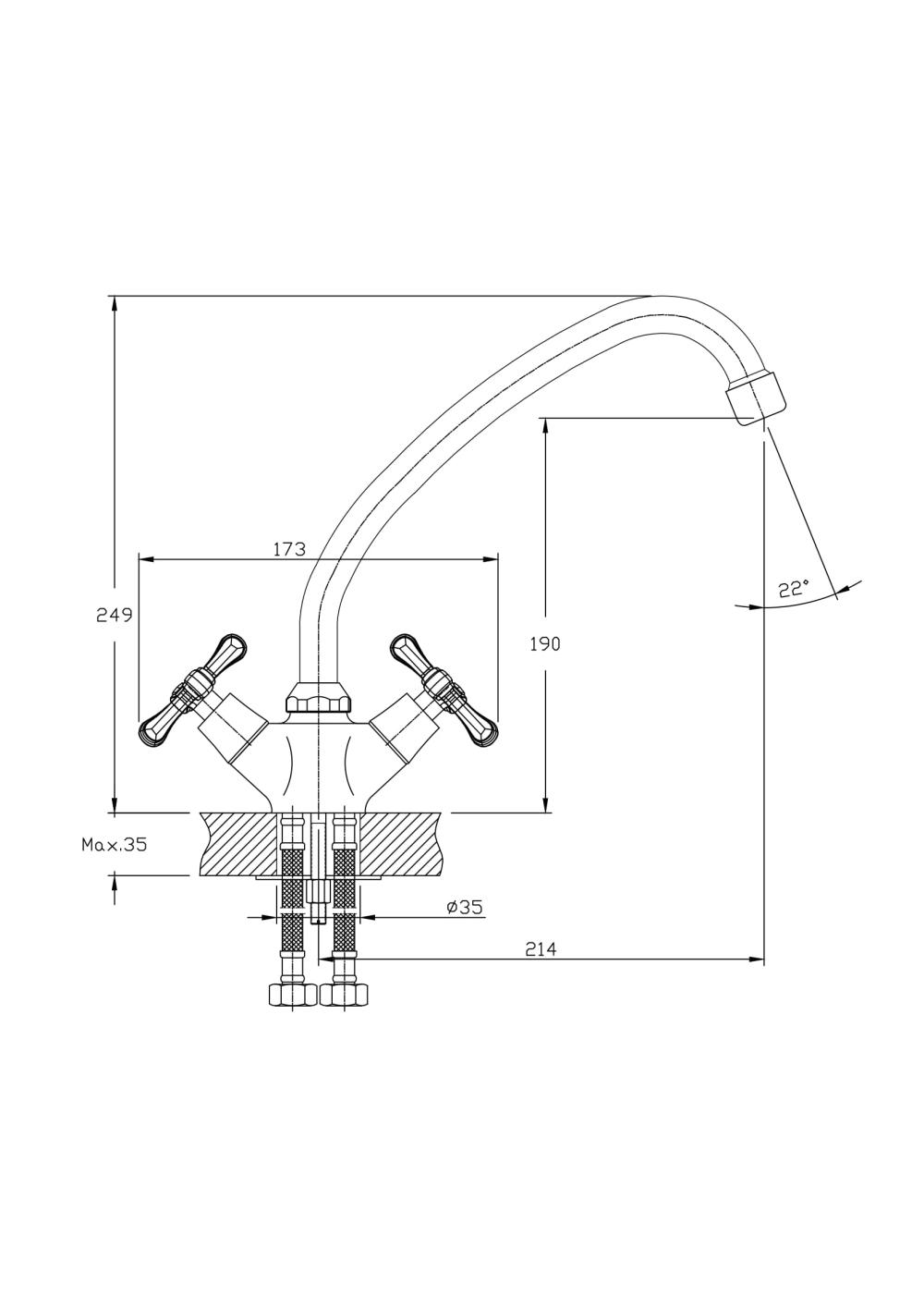 В смеситель установлены кран-буксы (RSH502) с керамическими пластинами. Высота смесителя 249 мм. Излив поворотный 214 мм. Высота излива до аэратора 190 мм. Аэратор изготовлен из пластика с нержавеющим корпусом, угол наклона - 22 гр.