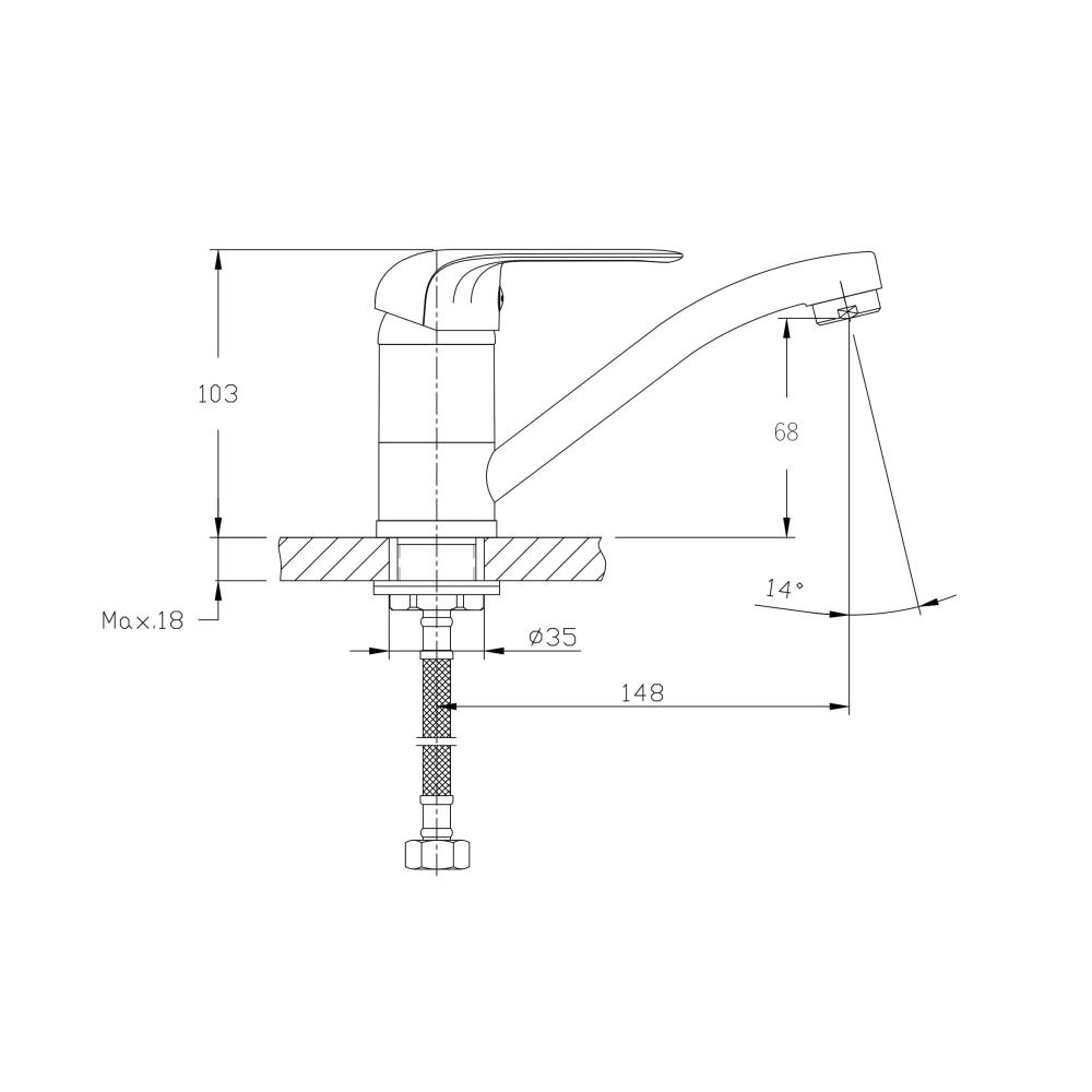 Смеситель для кухни с поворотным изливом RUSH арт.FI1835-26 из коллекции Fiji c металлической ручкой и имеет рычажное управление. В смеситель установлен картридж D-35 (RSH102) с керамическими пластинами. Высота смесителя 103 мм. Излив поворотный 360гр, 148 мм. Высота излива до аэратора 68 мм. Аэратор изготовлен из пластика с нержавеющим корпусом, угол наклона аэратора -14 гр. В комплекте гибкая подводка с латунными гайками 35см - 2 шт, присоединительная гайка S-30мм, втулка-27мм, фум-лента, индивидуальный пакет, паспорт, гарантийный талон.
