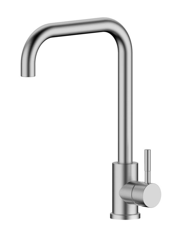 Смеситель для кухни с высоким поворотным изливом RUSH Melos арт. SUS1101-23 с металлической ручкой изготовлен из нержавеющей стали SUS304 и имеет рычажное управление.