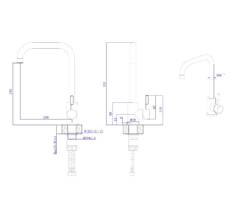 В смеситель установлен картридж D-35 с керамическими пластинами. Высота смесителя 331мм. Излив поворотный 208мм. Высота излива до аэратора 248мм. Аэратор изготовлен из пластика с нержавеющим корпусом, угол наклона аэратора- 7 гр.