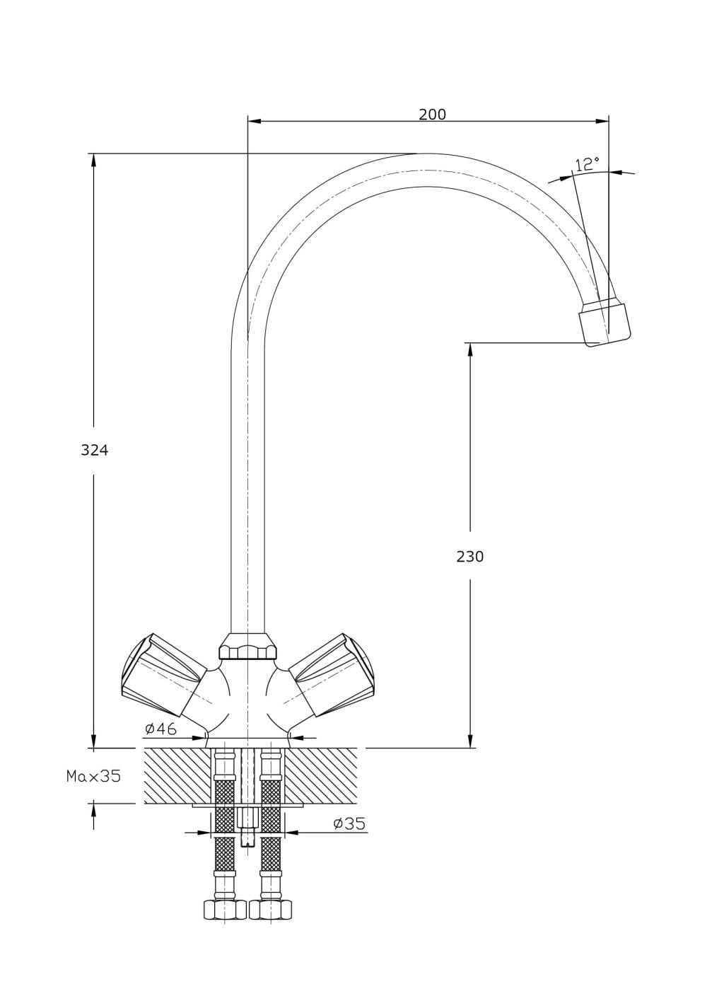 В смеситель установлены кран-буксы (RSH502) с керамическими пластинами. Высота смесителя 324 мм. Излив поворотный (360гр), 200 мм. Высота излива до аэратора 230 мм. Аэратор изготовлен из пластика с нержавеющим корпусом, угол наклона - 12 гр.