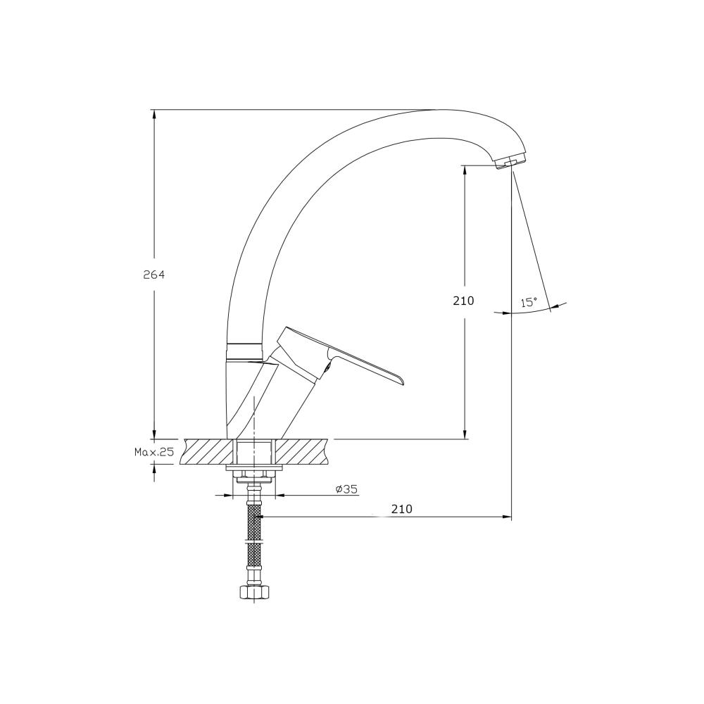 В смеситель установлен картридж D-35 (RSH102) с керамическими пластинами. Высота смесителя 250 мм. Излив поворотный 360гр, 210 мм. Высота излива до аэратора 210 мм. Аэратор изготовлен из пластика с нержавеющим корпусом, угол наклона аэратора -15 гр.