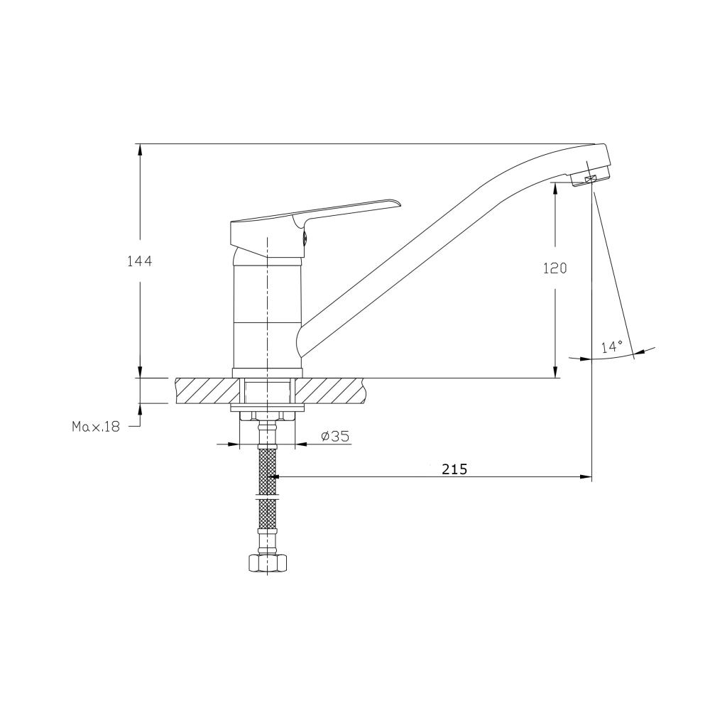 В смеситель установлен картридж D-35 (RSH102) с керамическими пластинами. Высота смесителя 114 мм. Излив поворотный, 215 мм. Высота излива до аэратора 120 мм. Аэратор изготовлен из пластика с нержавеющим корпусом, угол наклона - 14 гр.