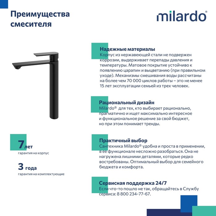 • Гарантия на смеситель Milardo® – 7 лет, на картридж – 3 года.